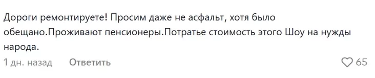 «Дороги ремонтируйте! Просим даже не асфальт, хотя было обещано. Проживают пенсионеры. Потратьте стоимость этого шоу на нужды народа».