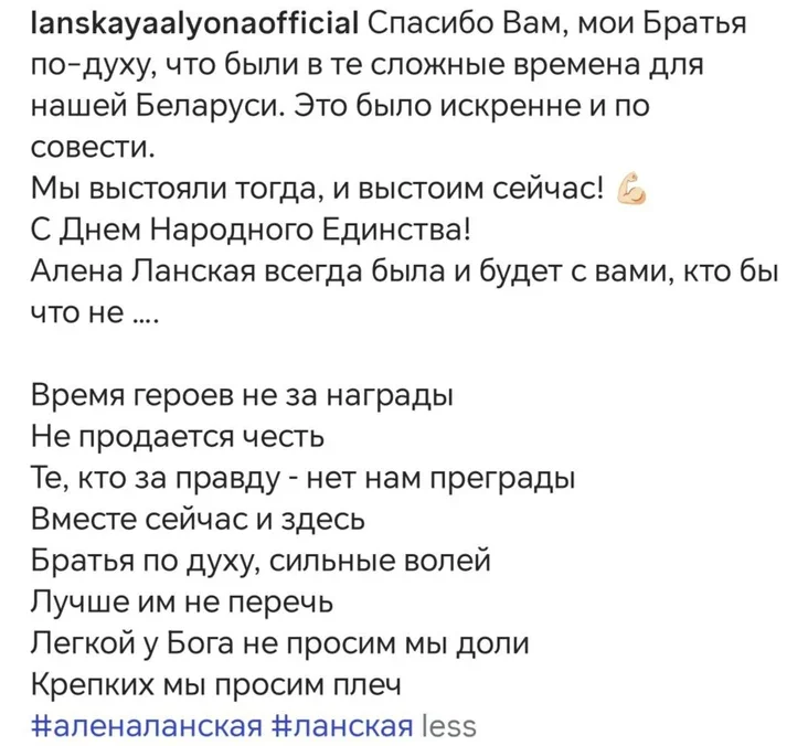 «Спасибо Вам, мои Братья по духу, что были в те сложные времена для нашей Беларуси. Это было искренне и честно. Мы выстояли тогда и выстоим сейчас! Алёна Ланская всегда была и будет с вами, кто бы что не…».