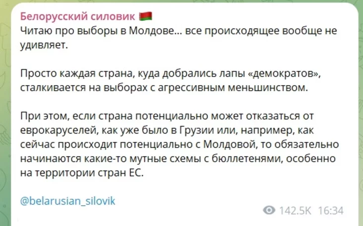 «Если страна потенциально может отказаться от еврокаруселей, как это уже было в Грузии или, например, как сейчас происходит потенциально с Молдовой, то обязательно начинаются какие-то мутные схемы с бюллетенями, особенно на территории стран ЕС», — писал «Белорусский силовик».
