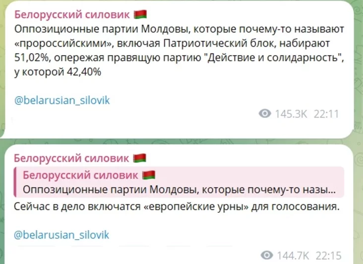 «Оппозиционные партии Молдовы, которые почему-то называют «пророссийскими», включая «Патриотический блок», набирают 51,02%, обгоняя правящую партию «Действие и солидарность», у которой 42,40%», — синхронно сообщал «Белорусский силовик».