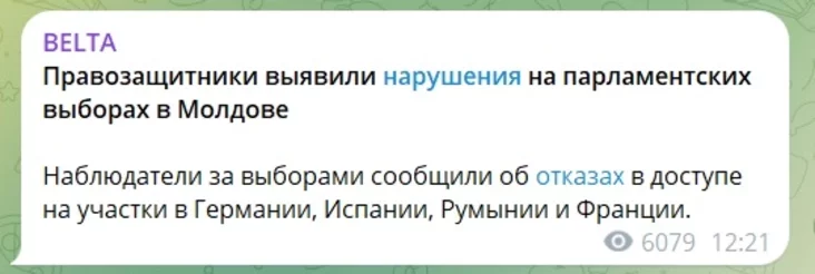 «Правозащитники выявили нарушения на парламентских выборах в Молдове. Наблюдатели за выборами сообщили об отказе в доступе на участки в Германии, Испании, Румынии и Франции», — писала БелТА.