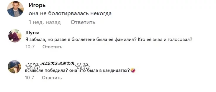 • Я забыла, но разве в бюллетене была её фамилия? Кто её знал и голосовал?