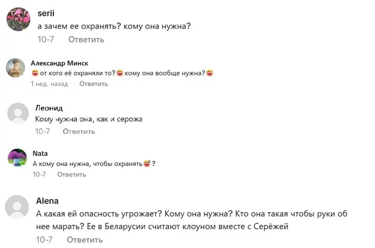 • А какая ей опасность грозит? Кому она нужна? Кто она такая, чтобы руки об неё марать? Её в Беларуси считают клоуном вместе с Серёжей.