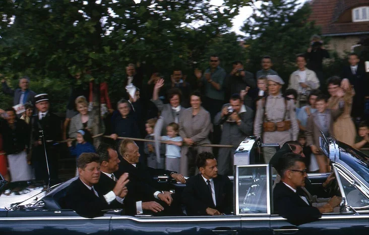 Президент США Джон Кеннеди (на переднем плане на заднем сиденье авто), бургомистр Берлина Вилли Брандт (в центре) и канцлер ФРГ Конрад Аденауэр. Берлин, 26 июня 1963 года. Фото: Wikipedia Commons