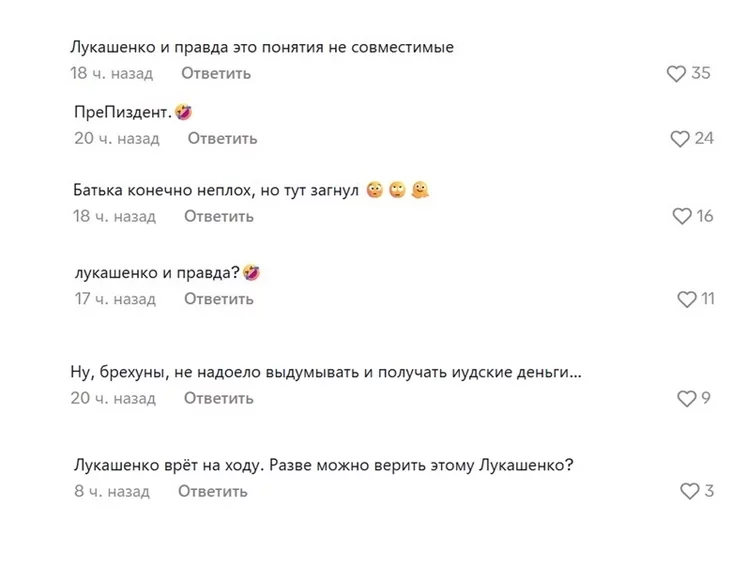 «Лукашенко и правда — это понятия не совместимые», «Преп**дент», «Батька, конечно, неплох, но тут загнул», «Лукашенко и правда?»