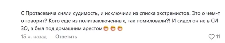 «С Протасевича сняли судимость и исключили из списка экстремистов. Это о чем-то говорит? Кого еще из политзаключенных так помиловали?! И сидел он не в СИЗО, а был под домашним арестом», — доказывает кто-то.