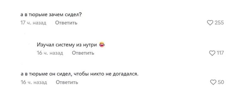 На третьем месте (свыше 250 лайков) вопрос «А в тюрьме зачем сидел?»