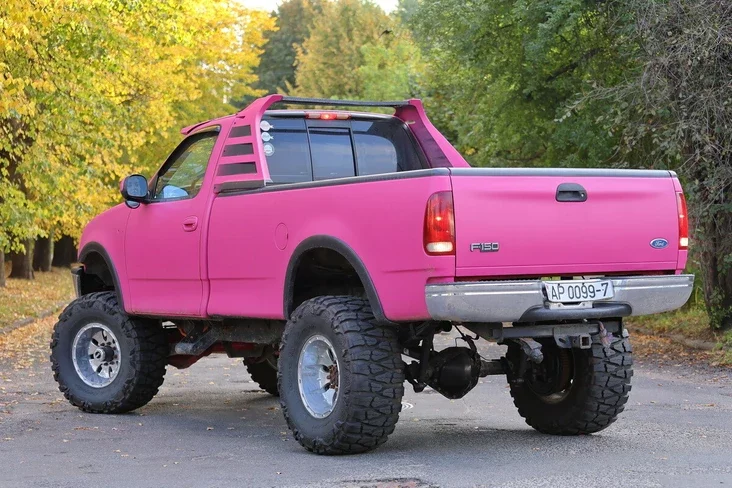 «Машина была черно-красной и с какими-то черепами. Мне такой образ не нравился. И однажды в голову пришла мысль: «А что, если сделать Ford розовым?» Короче, я закатала его в покрытие Raptor! И, как сказал маляр, этот пикап теперь выглядит как бархатные сапожки. Цена вопроса — 2 500 долларов».