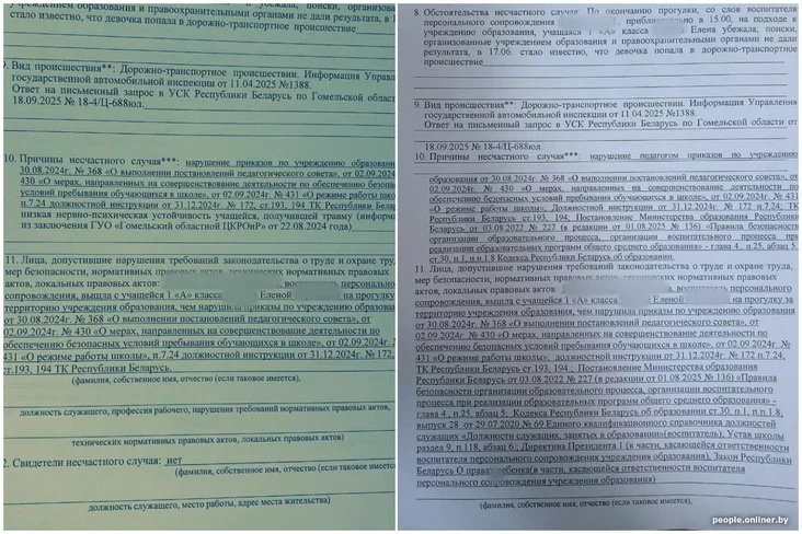 Речь о пункте 10, где перечислены причины несчастного случая. Там, помимо нарушения приказов и должностной инструкции педагогом, было указание и на «низкую нервно-психическую устойчивость учащейся, получившей травму» (со ссылкой на заключение ГУО «Гомельский областной ЦКРОиР»).