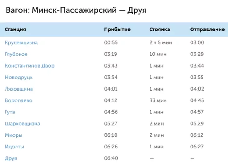 Этот поезд непросто найти в расписании на сайте БЖД: если по привычке задать дни курсирования «все дни», то система может показать, что таких поездов нет совсем: так, от Минска до Друи и от Крулевщины до Друи они показываются, а от Воропаево — нет. Загадка железнодорожной дыры!