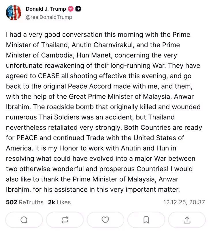 «Сегодня утром у меня состоялся очень хороший разговор с премьер-министром Таиланда Анутином Чанвиракуном и премьер-министром Камбоджи Хуном Манетом по поводу крайне прискорбного возобновления их давнего конфликта..