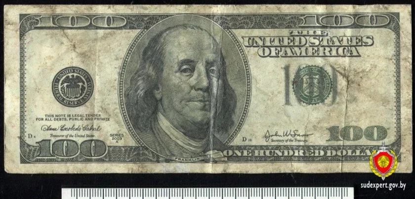 Купюру направили на экспертизу в Государственный комитет судебных экспертиз, где определили, что она не является настоящей. Эксперт отметил отсутствие регламентированных элементов защиты, другой способ печати, другую цветовую гамму, отсутствие серийных номеров, буквенно-цифрового индекса банка и текста с передней стороны. Это свидетельствует, что купюра была изготовлена не предприятием официальной печати.