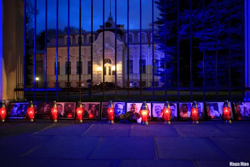 У ограды белорусского посольства в Вильнюсе выставлены портреты погибших от рук белорусского режима начиная с 1990-х, погибших во время протестов в 2020 году, умерших в колониях политзаключенных, а также погибших в Украине добровольцев.
